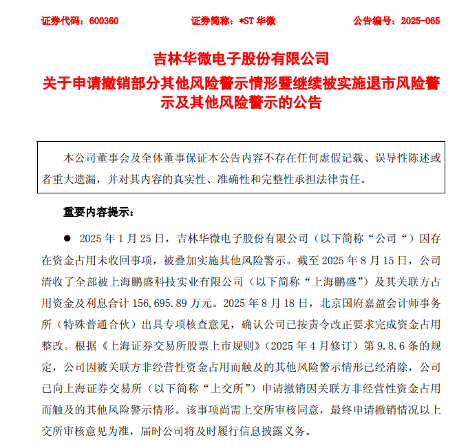 2025年8月18日,北京国府嘉盈会计师事务所(特殊普通合伙)出具专项核查意见,确认*ST华微已按责令改正要求完成资金占用整改。